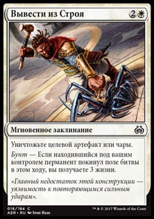 3+ В этом формате крайне важно бороться с артефактами. Опасные чары тоже есть. В обзоре Каладеша я угадал, что Вкус к Неестественному получит законное место в основе колод. Не вижу причин, почему Вывести из Строя не сможет сделать то же самое.