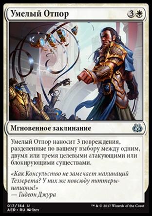 Умелый Отпор наносит 3 повреждения, разделенные по вашему выбору между одним, двумя или тремя целевыми атакующими или блокирующими существами.