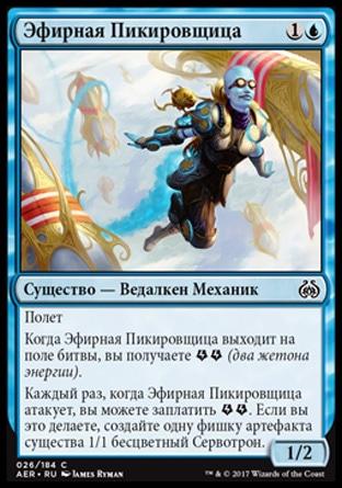 Каждый раз, когда Инспектор Эфира атакует, вы можете заплатить {Energy}{Energy}. Если вы это делаете, создайте одну фишку артефакта существа 1/1 бесцветный Сервотрон.