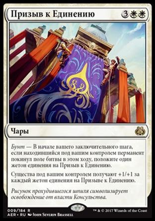 Бунт — В начале вашего заключительного шага, если находившийся под вашим контролем перманент покинул поле битвы в этом ходу, положите один жетон единения на Призыв к Единению.
