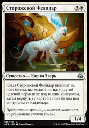 Когда Сторожевой Фелидар выходит на поле битвы, вы можете изгнать другой целевой перманент под вашим контролем, затем вернуть ту карту на поле битвы под контролем ее владельца.