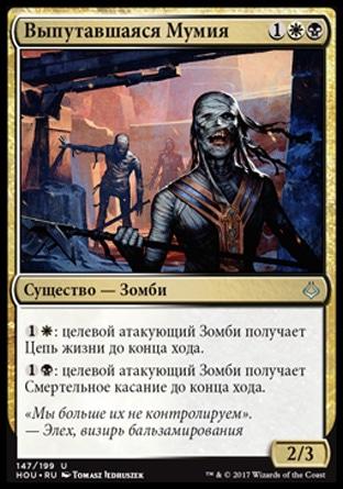 : изгоните целевую карту существа из кладбища. Создайте фишку, являющуюся ее копией, но при этом являющуюся черным Зомби 4/4.