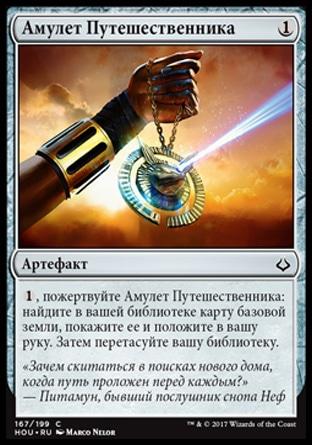 , пожертвуйте Амулет Путешественника: найдите в вашей библиотеке карту базовой земли, покажите ее и положите в вашу руку. Затем перетасуйте вашу библиотеку.