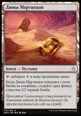 Когда Дюны Мертвецов попадают с поля битвы на кладбище, создайте одну фишку существа 2/2 черный Зомби.