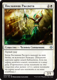 Когда Посланник Рассвета выходит на поле битвы, он использует Разведку. (Покажите верхнюю карту вашей библиотеки. Если та карта является землей, положите ее в вашу руку. В противном случае положите на это существо один жетон +1/+1, затем положите ту карту назад или положите ее на ваше кладбище.)