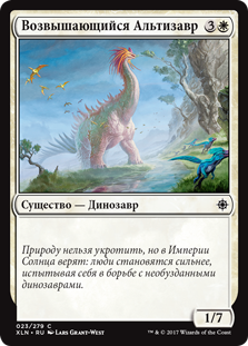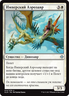 Когда Имперский Аэрозавр выходит на поле битвы, другое целевое существо под вашим контролем получает +1/+1 и Полет до конца хода.