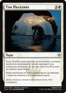 Когда Узы Иксалана выходят на поле битвы, изгоните целевой не являющийся землей перманент под контролем оппонента до тех пор, пока Узы Иксалана не покинут поле битвы.