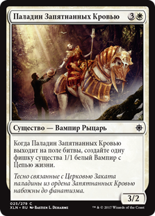 Когда Паладин Запятнанных Кровью выходит на поле битвы, создайте одну фишку существа 1/1 белый Вампир с Цепью жизни.