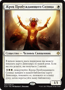 , пожертвуйте Жреца Пробуждающего Солнца: найдите в вашей библиотеке карту Динозавра, покажите ее, положите ее в вашу руку, затем перетасуйте вашу библиотеку.