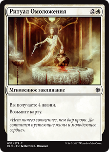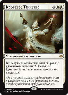 Вы получаете количество жизней, равное удвоенному значению X. Положите Кровавое Таинство в низ библиотеки его владельца.