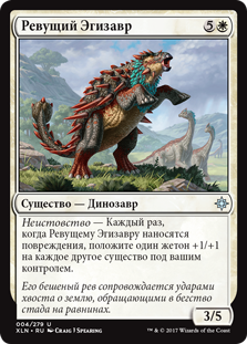 Неистовство — Каждый раз, когда Ревущему Эгизавру наносятся повреждения, положите один жетон +1/+1 на каждое другое существо под вашим контролем.