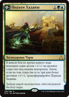 В начале боя во время вашего хода положите один жетон +1/+1 на целевое существо под вашим контролем. Затем, если на том существе есть три или более жетонов +1/+1, трансформируйте Подъем Хаданы.