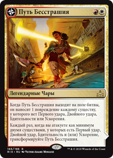Каждый раз, когда вы атакуете как минимум двумя существами, у которых есть Первый удар, Двойной удар, Бдительность и (или) Ускорение, трансформируйте Путь Бесстрашия.