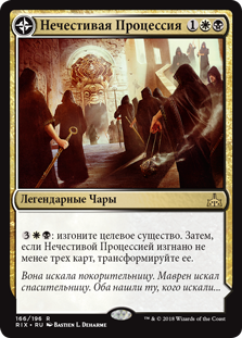 : изгоните целевое существо. Затем, если Нечестивой Процессией изгнано не менее трех карт, трансформируйте ее.