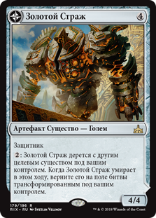 : Золотой Страж дерется с другим целевым существом под вашим контролем. Когда Золотой Страж умирает в этом ходу, верните его на поле битвы трансформированным под вашим контролем.