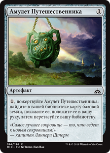 , пожертвуйте Амулет Путешественника: найдите в вашей библиотеке карту базовой земли, покажите ее и положите в вашу руку. Затем перетасуйте вашу библиотеку.