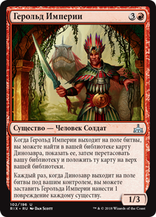 Когда Герольд Империи выходит на поле битвы, вы можете найти в вашей библиотеке карту Динозавра, показать ее, затем перетасовать вашу библиотеку и положить ту карту на верх вашей библиотеки.