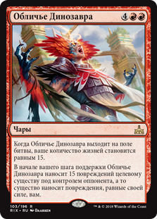 В начале вашего шага поддержки Обличье Динозавра наносит 15 повреждений целевому существу под контролем оппонента, а то существо наносит повреждения, равные своей силе, вам.