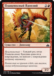 Неистовство — Каждый раз, когда Плащеносному Ядоплюю наносятся повреждения, он наносит 2 повреждения целевому оппоненту.