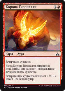 Когда Корона Тилоналли выходит на поле битвы, она наносит 1 повреждение зачарованному существу.