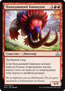 Неистовство — Каждый раз, когда Иглозубому Раптору наносятся повреждения, он наносит 5 повреждений целевому существу под контролем оппонента.