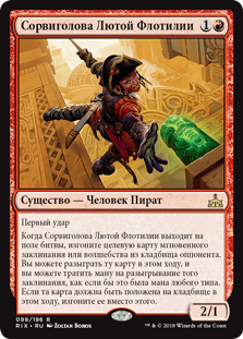 Когда Сорвиголова Лютой Флотилии выходит на поле битвы, изгоните целевую карту мгновенного заклинания или волшебства из кладбища оппонента. Вы можете разыграть ту карту в этом ходу, и вы можете тратить ману на разыгрывание того заклинания, как если бы это была мана любого типа. Если та карта должна быть положена на кладбище в этом ходу, изгоните ее вместо этого.