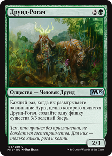 Каждый раз, когда вы разыгрываете заклинание Ауры, целью которого является Друид-Рогач, создайте одну фишку существа 3/3 зеленый Зверь.