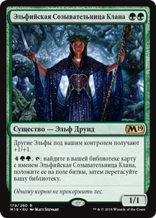 : найдите в вашей библиотеке карту с именем Эльфийская Созывательница Клана, положите ее на поле битвы, затем перетасуйте вашу библиотеку.