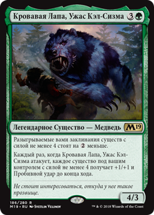 Каждый раз, когда Кровавая Лапа, Ужас Кэл-Сизма атакует, каждое существо под вашим контролем с силой не менее 4 получает +1/+1 и Пробивной удар до конца хода.
