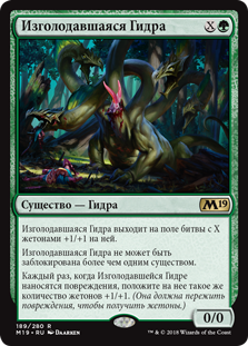 Каждый раз, когда Изголодавшейся Гидре наносятся повреждения, положите на нее такое же количество жетонов +1/+1. (Она должна пережить повреждения, чтобы получить жетоны.)