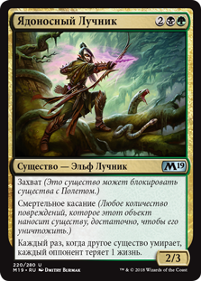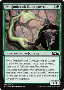 Когда Эльфийский Омолодитель выходит на поле битвы, посмотрите пять верхних карт вашей библиотеки. Вы можете положить находящуюся среди них карту земли на поле битвы повернутой. Положите остальные карты в низ вашей библиотеки в случайном порядке.