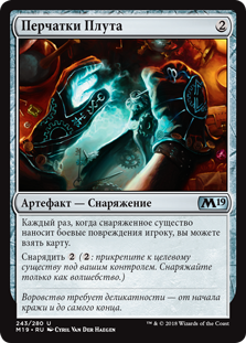 Каждый раз, когда снаряженное существо наносит боевые повреждения игроку, вы можете взять карту.
