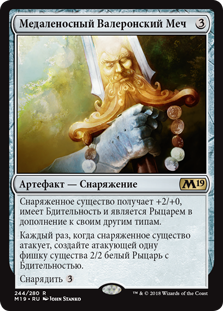 Каждый раз, когда снаряженное существо атакует, создайте атакующей одну фишку существа 2/2 белый Рыцарь с Бдительностью.