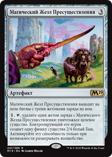 , удалите один жетон заряда с Магического Жезла Пресуществления: уничтожьте целевое существо. Контролирующий его игрок создает одну фишку существа 2/4 белый Бык. Активируйте эту способность только при возможности разыгрывать волшебство.