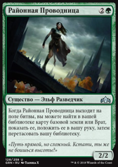 Когда Районная Проводница выходит на поле битвы, вы можете найти в вашей библиотеке карту базовой земли или Врат, показать ее, положить ее в вашу руку, затем перетасовать вашу библиотеку.