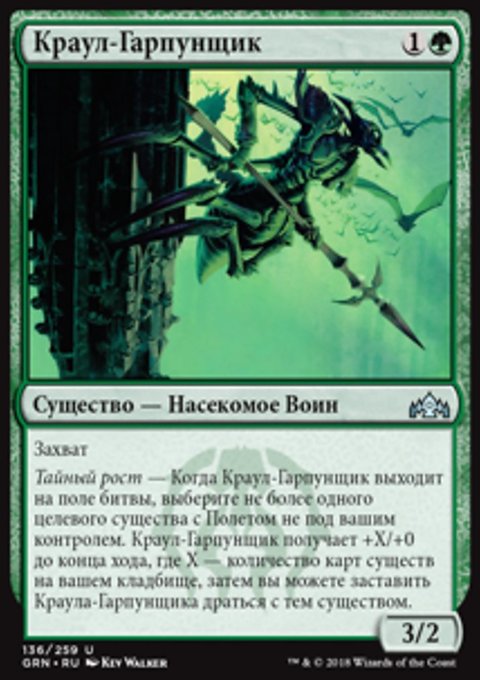 Тайный рост — Когда Краул-Гарпунщик выходит на поле битвы, выберите не более одного целевого существа с Полетом не под вашим контролем. Краул-Гарпунщик получает +X/+0 до конца хода, где X — количество карт существ на вашем кладбище, затем вы можете заставить Краула-Гарпунщика драться с тем существом.
