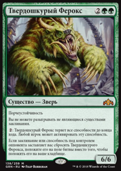 Если заклинание или способность под контролем оппонента заставляет вас сбросить Твердошкурого Ферокса, положите его на поле битвы вместо того, чтобы положить его на ваше кладбище.