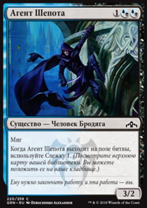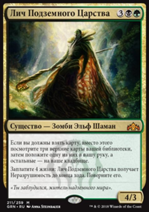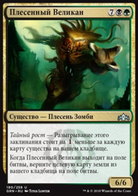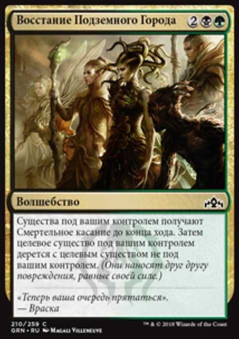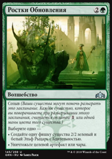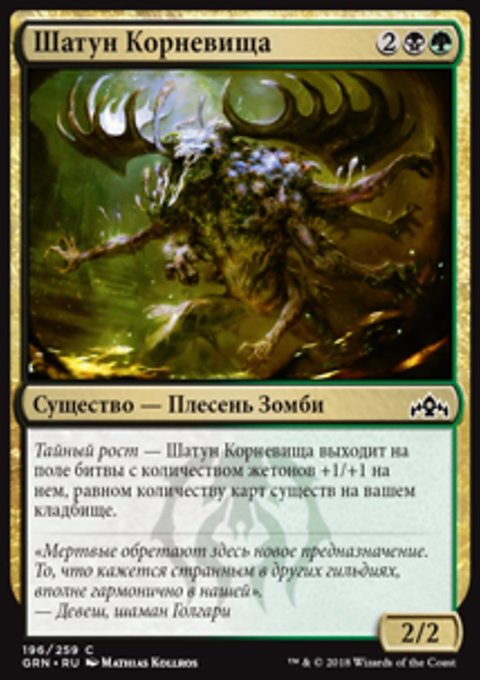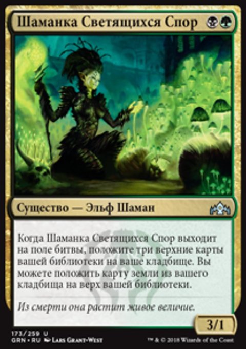 Тайный рост — Когда вы разыгрываете это заклинание, покажите X верхних карт вашей библиотеки, где X — количество карт существ на вашем кладбище. Вы можете положить на поле битвы находящуюся среди них карту зеленого перманента с конвертированной мана-стоимостью не более X. Положите остальные карты в низ вашей библиотеки в случайном порядке.