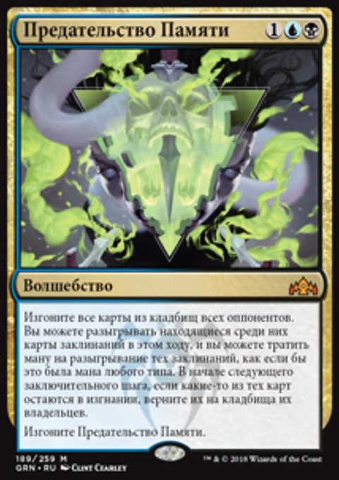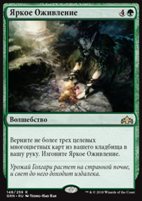 Верните не более трех целевых многоцветных карт из вашего кладбища в вашу руку. Изгоните Яркое Оживление.