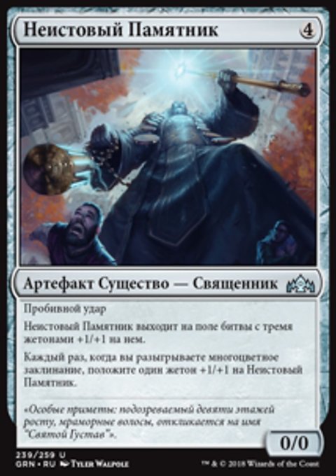 Неистовый Памятник выходит на поле битвы с тремя жетонами +1/+1 на нем.