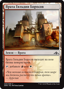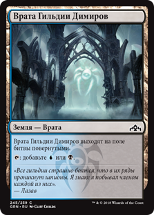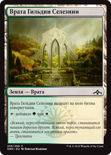 Найдите в вашей библиотеке не более двух карт базовых земель и (или) Врат, положите их на поле битвы повернутыми, затем перетасуйте вашу библиотеку.