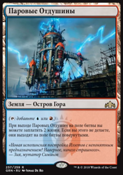 При выходе Паровых Отдушин на поле битвы, вы можете заплатить 2 жизни. Если вы этого не делаете, Паровые Отдушины выходят на поле битвы повернутыми.