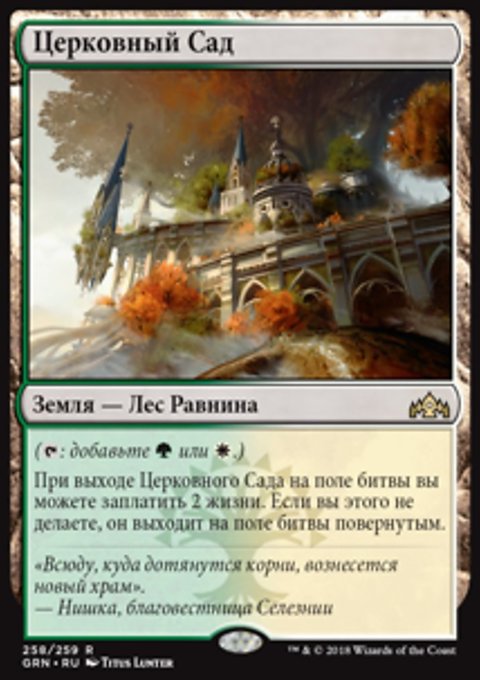 При выходе Церковного Сада на поле битвы вы можете заплатить 2 жизни. Если вы этого не делаете, Церковный Сад выходит на поле битвы повернутым.