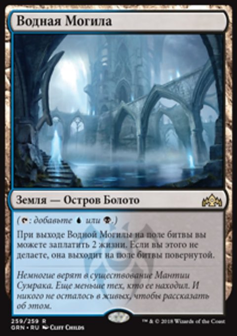 При выходе Водной Могилы на поле битвы вы можете заплатить 2 жизни. Если вы этого не делаете, Водная Могила выходит на поле битвы повернутой.