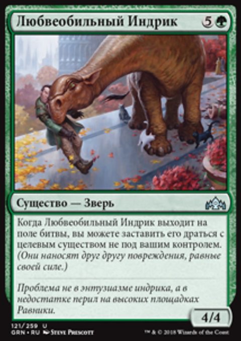 Когда Любвеобильный Индрик выходит на поле битвы, вы можете заставить его драться с целевым существом не под вашим контролем. (Они наносят друг другу повреждения, равные своей силе.)