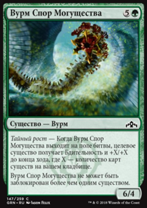 Тайный рост — Когда Вурм Спор Могущества выходит на поле битвы, целевое существо получает Бдительность и +X/+X до конца хода, где X — количество карт существ на вашем кладбище.