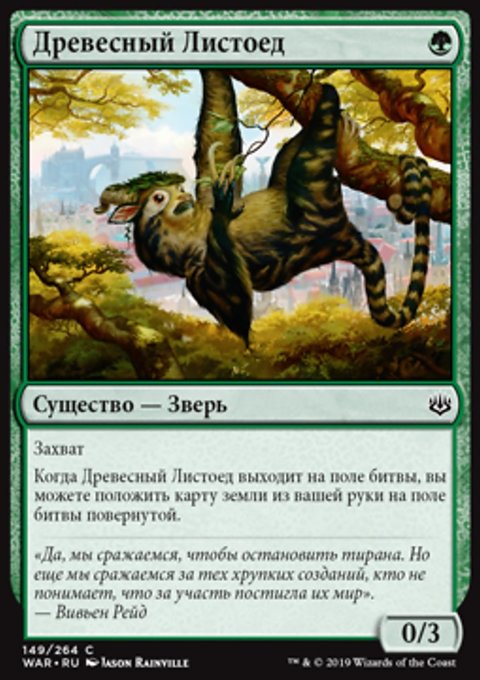 Когда Древесный Листоед выходит на поле битвы, вы можете положить карту земли из вашей руки на поле битвы повернутой.