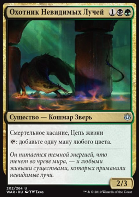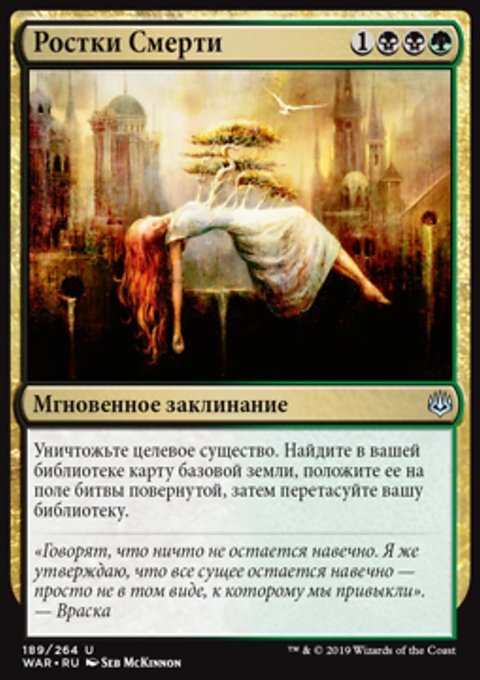 –2: посмотрите четыре верхние карты вашей библиотеки. Вы можете показать находящуюся среди них не являющуюся существом или землей карту и положить ее в вашу руку. Положите остальные карты в низ вашей библиотеки в случайном порядке.