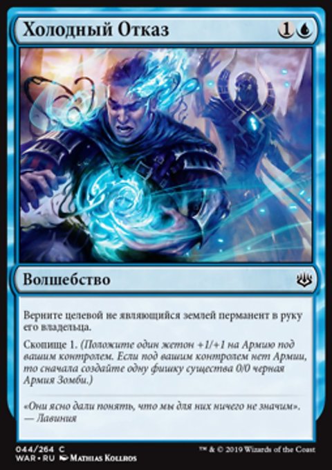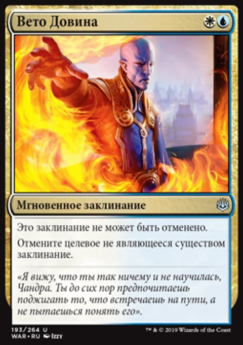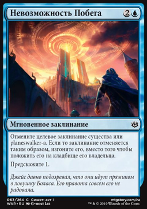 Отмените целевое заклинание существа или planeswalker-а. Если то заклинание отменяется таким образом, изгоните его, вместо того чтобы положить его на кладбище его владельца.