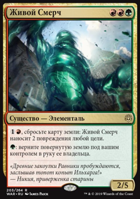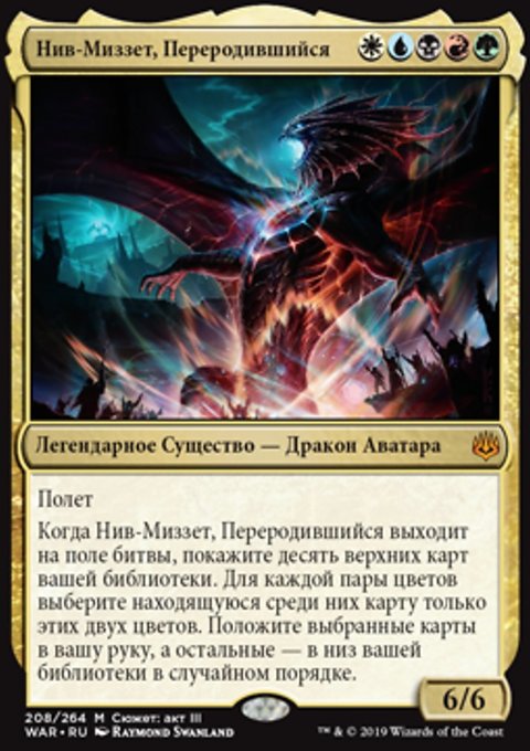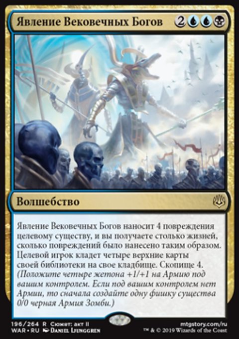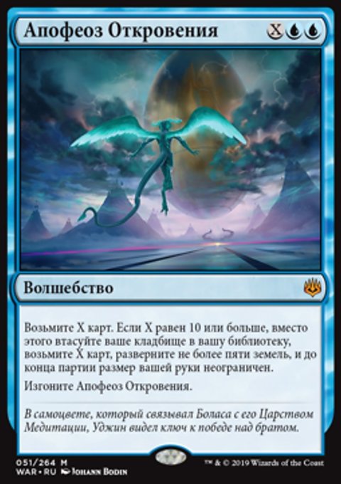 Возьмите Х карт. Если X равен 10 или больше, вместо этого втасуйте ваше кладбище в вашу библиотеку, возьмите X карт, разверните не более пяти земель, и до конца партии размер вашей руки неограничен.